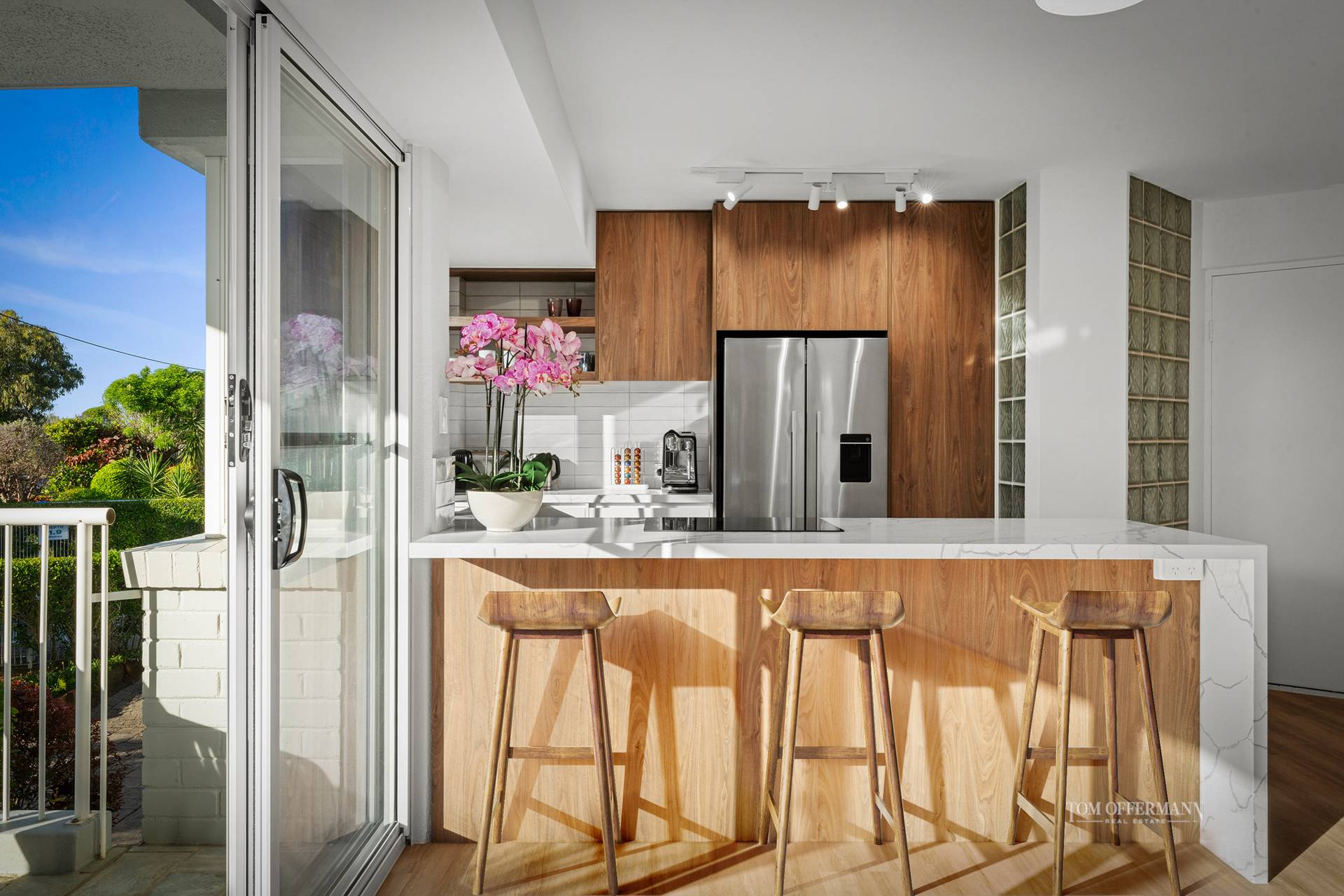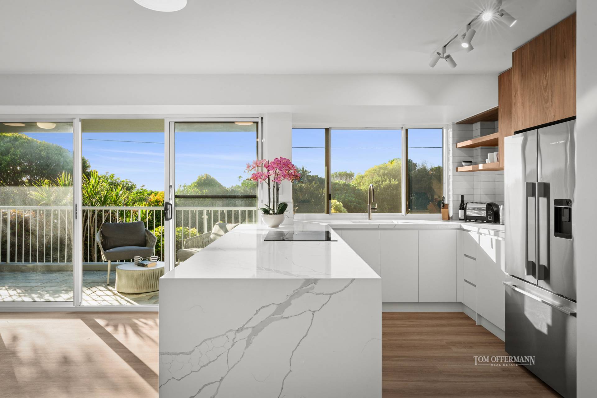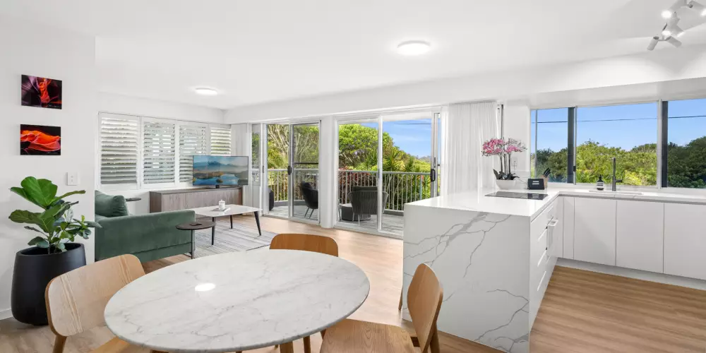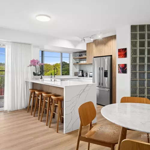 Meticulously transformed, the apartment blends timeless coastal charm with refined modern style. Warm timber look floors, crisp white shutters and a flowing single-level layout create an inviting, light-filled ambiance. The designer kitchen takes centre stage, complete with stone waterfall benchtops and premium Miele appliances - ideal for easy everyday living or entertaining with flair.