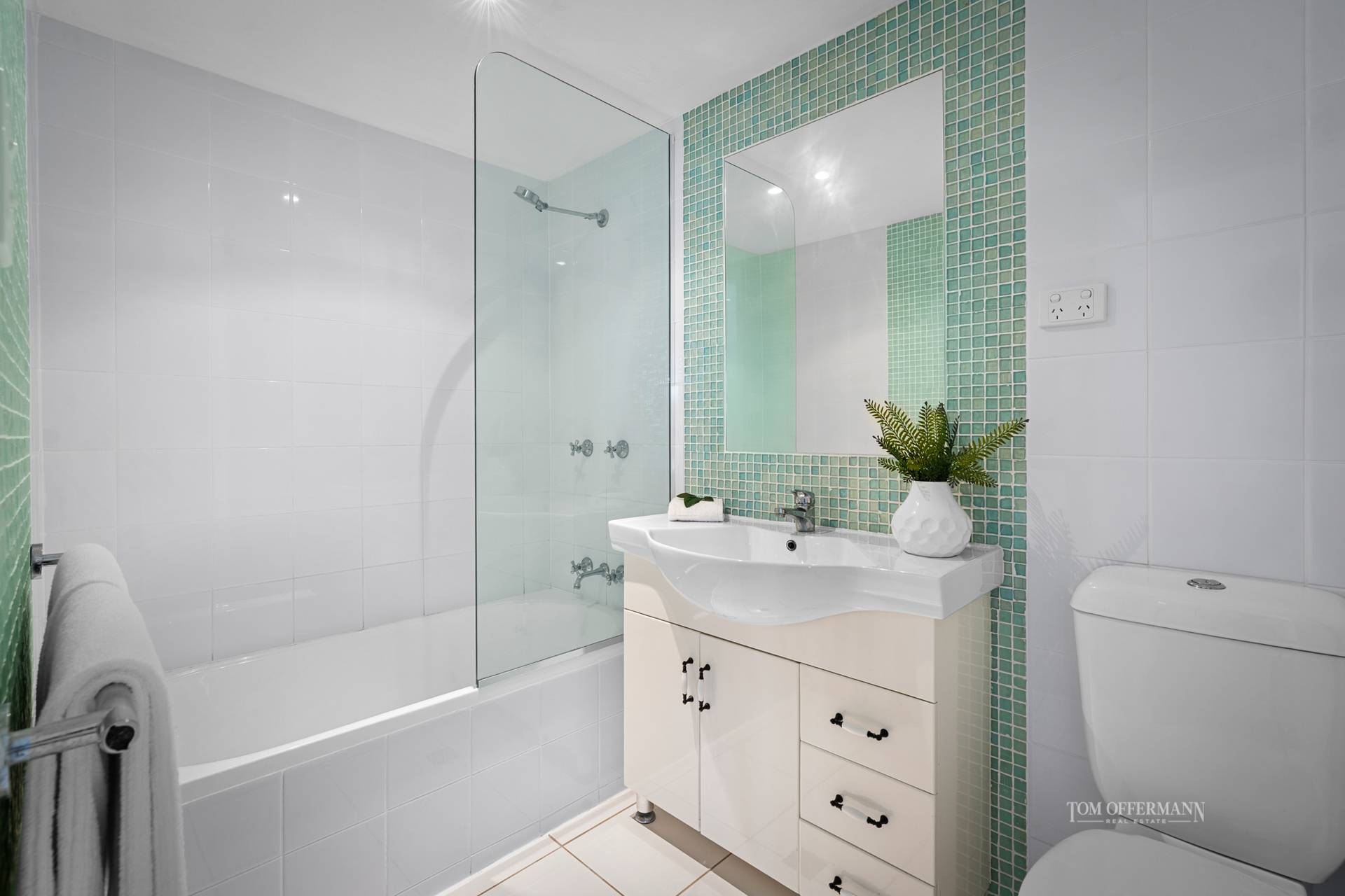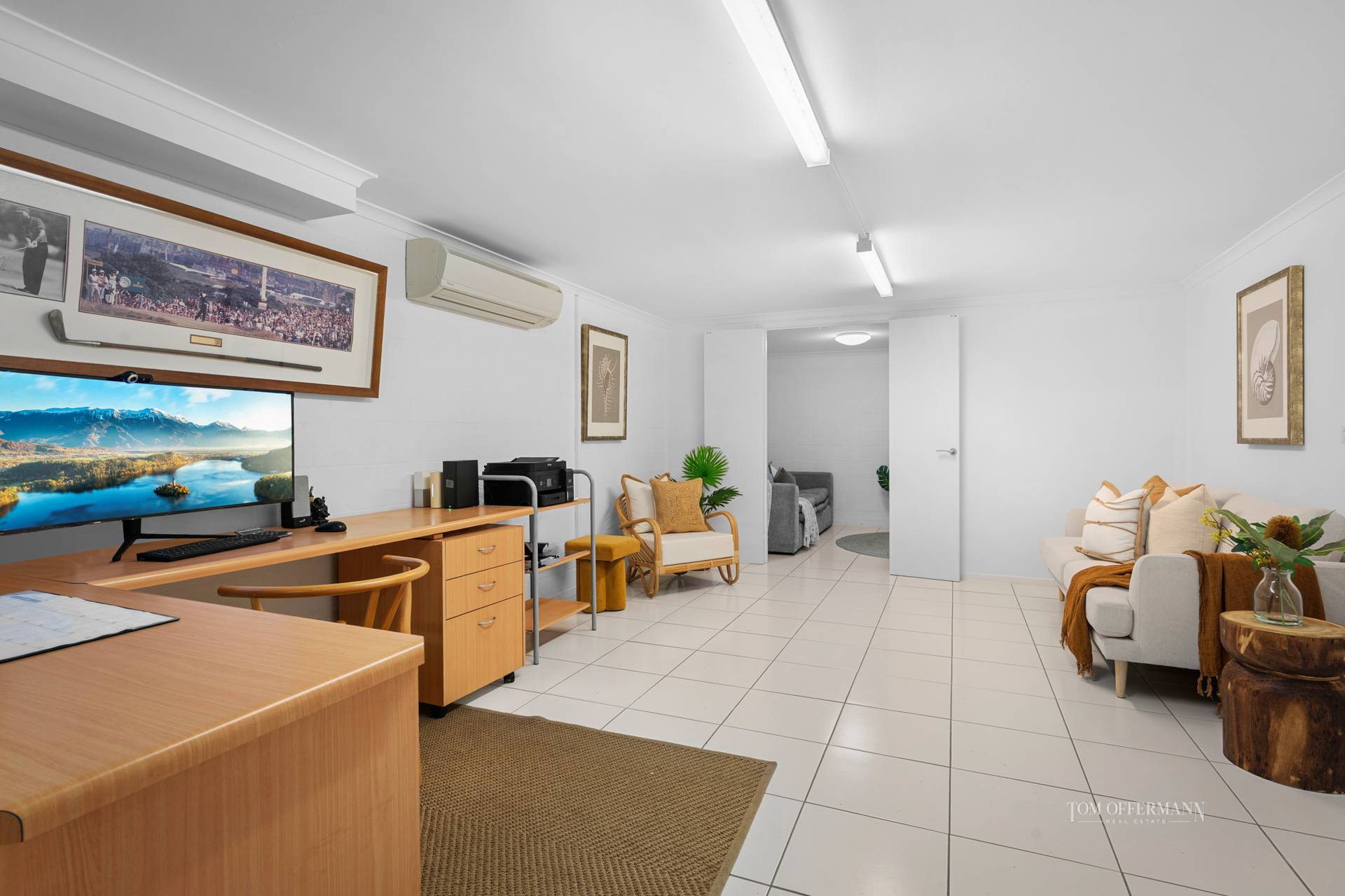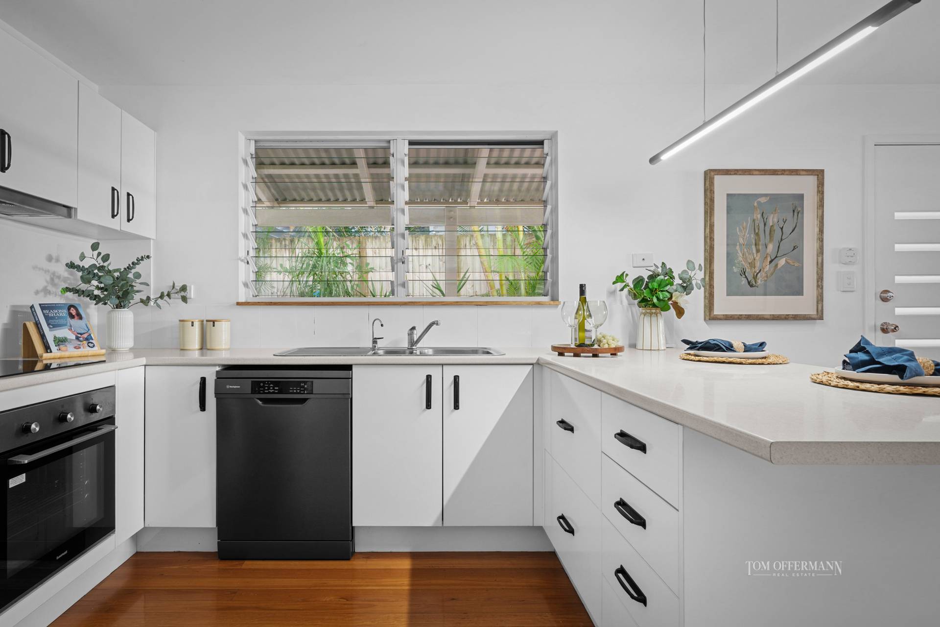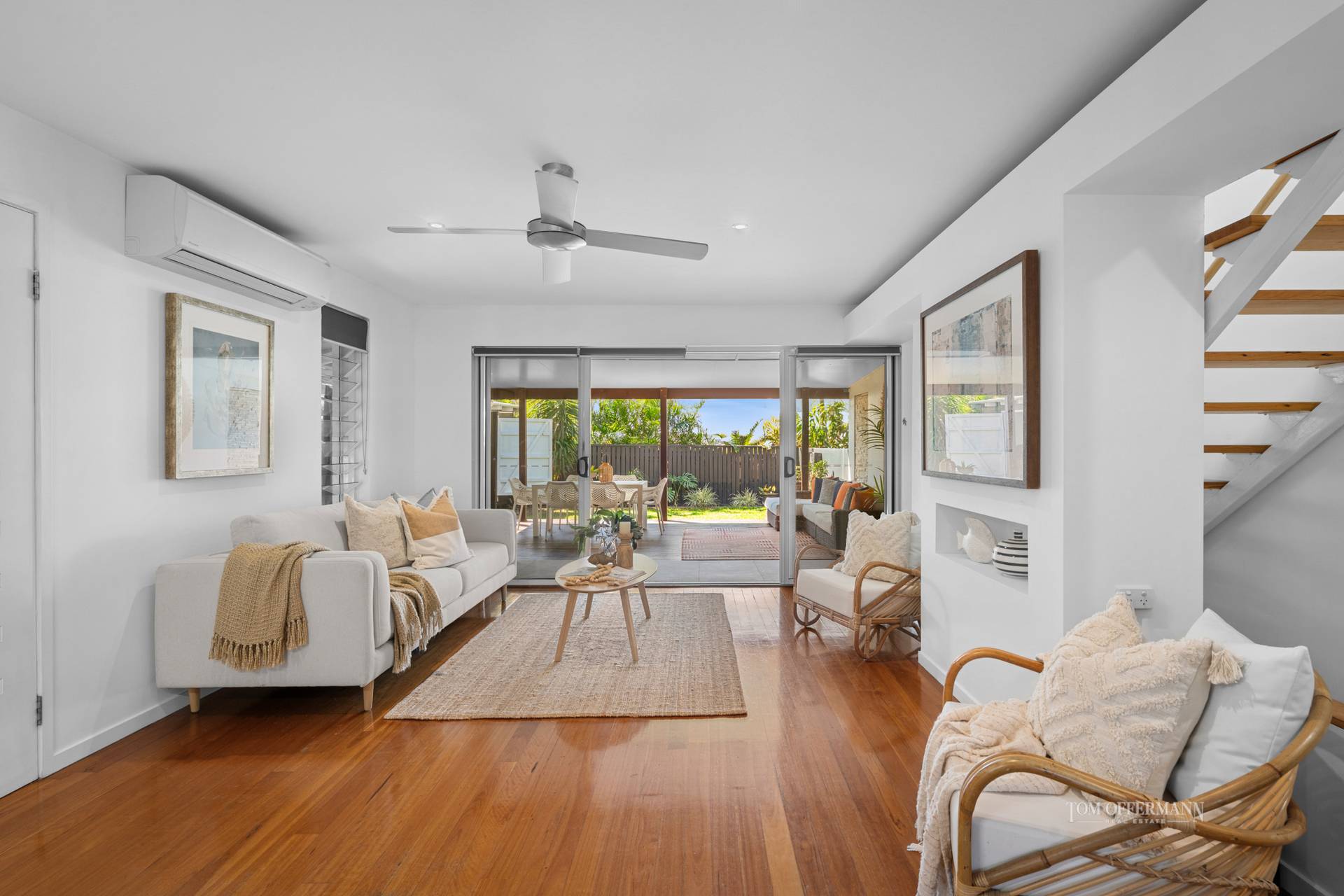 From the street, the striking contemporary exterior spread over three floors draws you in and hints at the elegance that awaits you inside. On the middle level, the main living zone is generous and inviting with gorgeous timber flooring, a white kitchen, and glass sliding doors that lead out onto your very own tropical haven and private outdoor entertaining area.