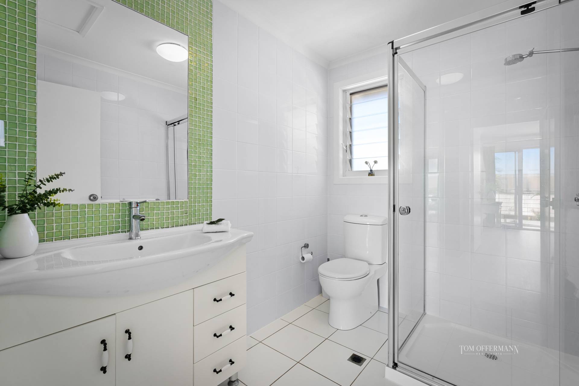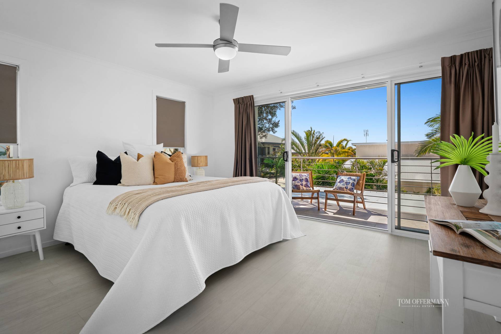 The main bedroom is also on this level with a beach inspired ensuite bathroom and a private balcony overlooking the lush front gardens. Upstairs, two bedrooms and a bathroom cater for the family, with one bedroom boasting an exclusive balcony.
