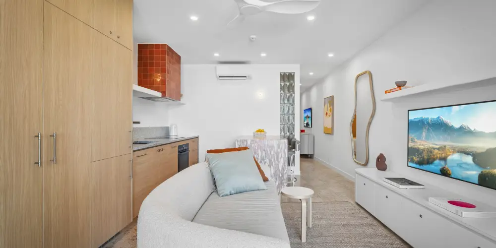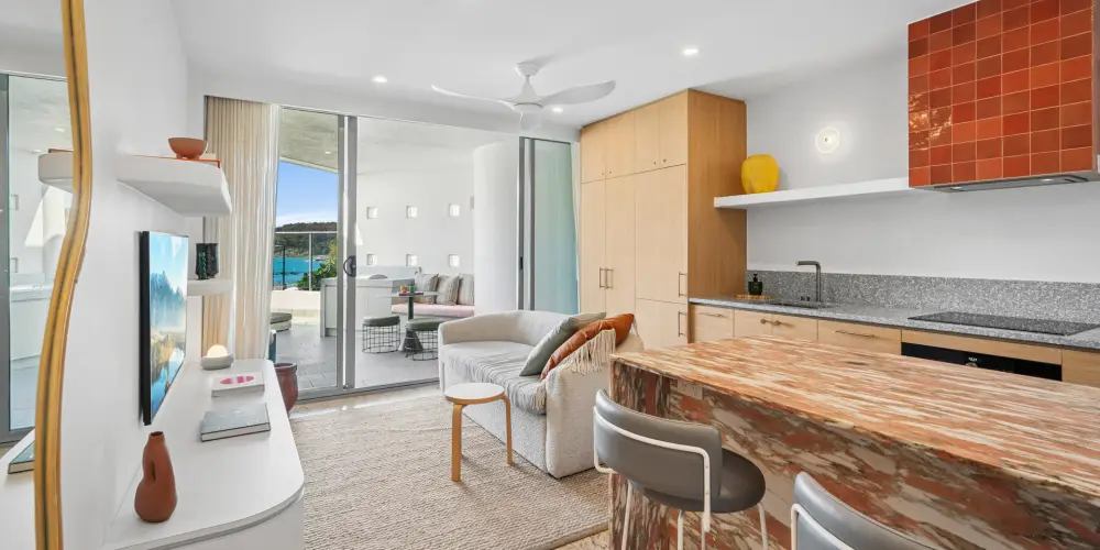 Wispy linen sheers catch the breeze, natural light bounces shadow-like over the cork flooring, curved features are aplenty including the sumptuous white boucle sofa, custom console, designer mirrors, and all complemented by pendants, artifacts and accessories.