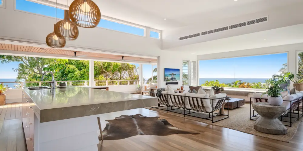 Imagine the ultimate lavish beach house entertainer, cossetted confidently on the prized dune, viewing idyllically north-east from the Noosa National Park Headland of Sunshine Beach with explosive 180-degree views, across the sapphire Coral Sea along the coastline to Mooloolaba, bright blue like a cloudless sky, and mere minutes to surf and squeaky sand. Yes, the scene is truly picture-perfect.