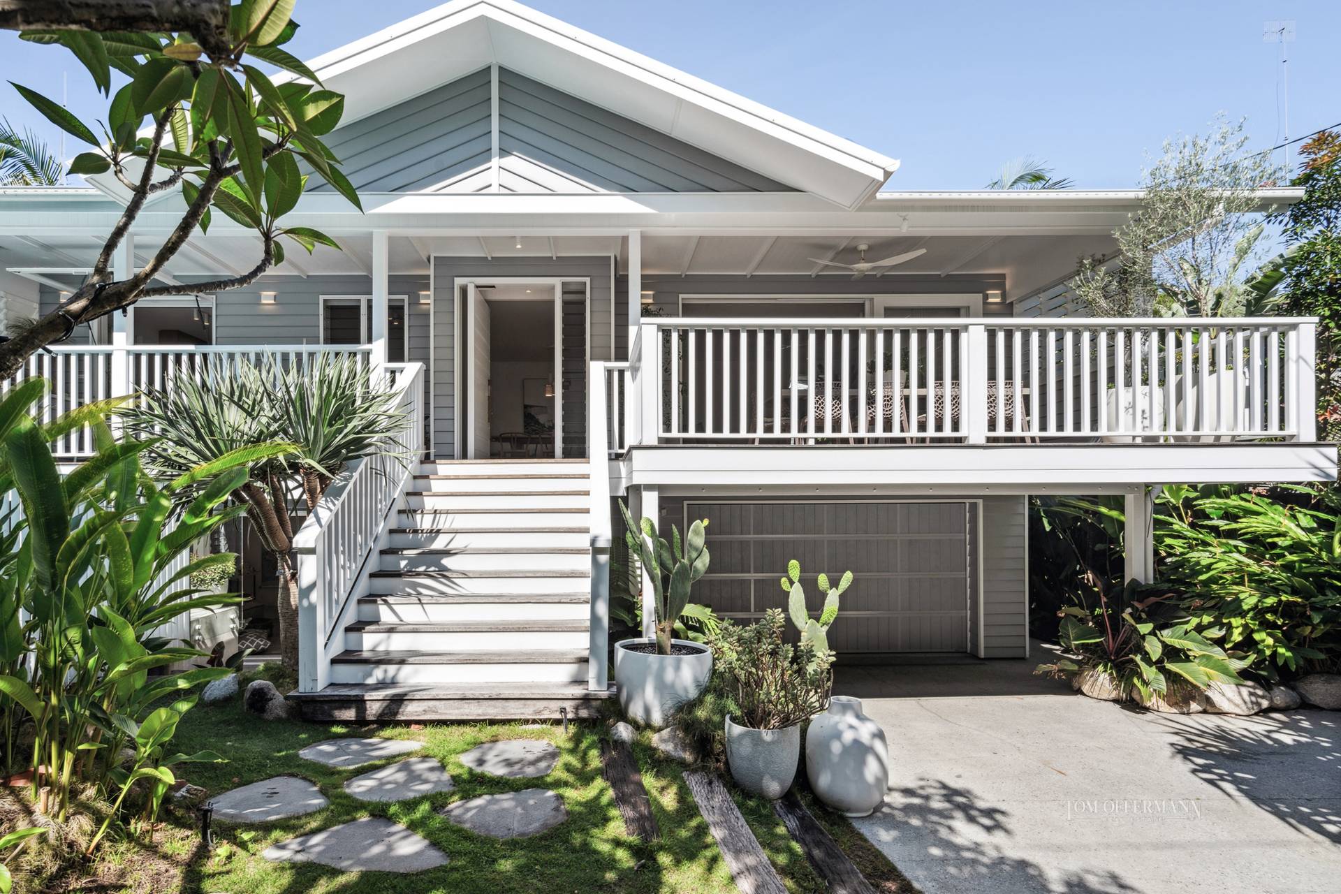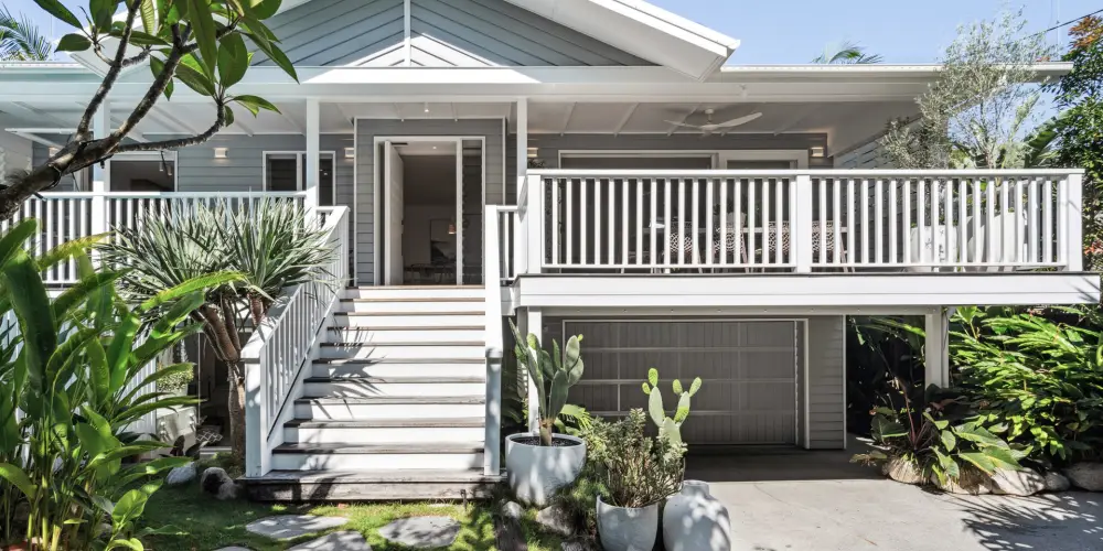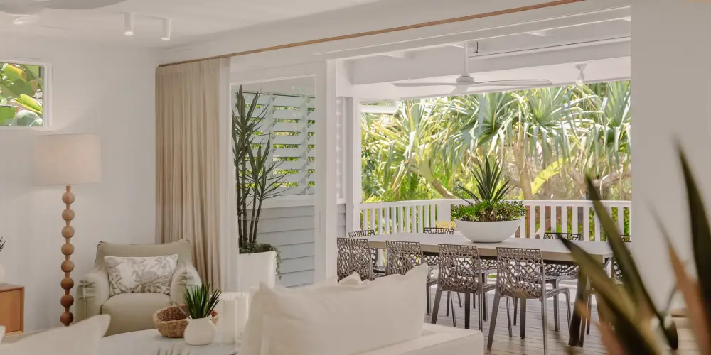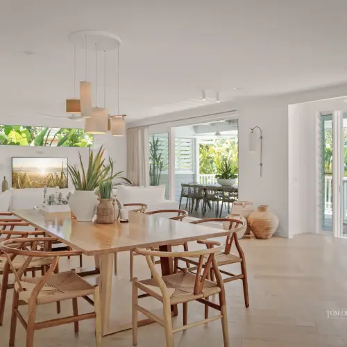 Beyond the Palm Springs-inspired entrance, you'll be welcomed by lush tropical gardens leading up to the stairs. As you step through the pivoting timber door, a world of refined luxury unfolds. This unique home or holiday house, known as 'Lola,' harmoniously blends contemporary Hamptons style with a touch of Queenslander charm and Scandinavian elegance. The design strikes a perfect balance between barefoot luxe and practicality, offering multiple spaces for gathering, entertaining, and creating lasting memories, while also providing private retreats for everyone.