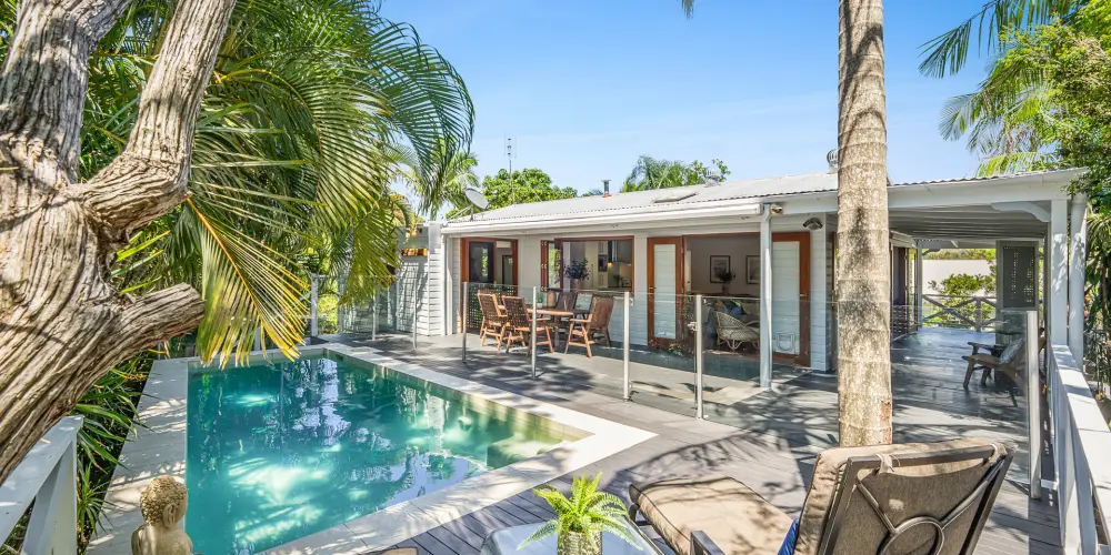 Lovingly appointed, the residence reveals three generous bedrooms upstairs and two bathrooms, centred around light-filled open-plan living and dining spaces designed for both comfort and connection. As you are ushered by the brass of the hardware and the timber French doors onto the covered wraparound timber deck, it becomes easy to settle in and enjoy the seamless indoor outdoor flow from the kitchen, through the servery window and out to the sounds of family and friends enjoying the lapping of the pool while the light shimmers across it's surface.
