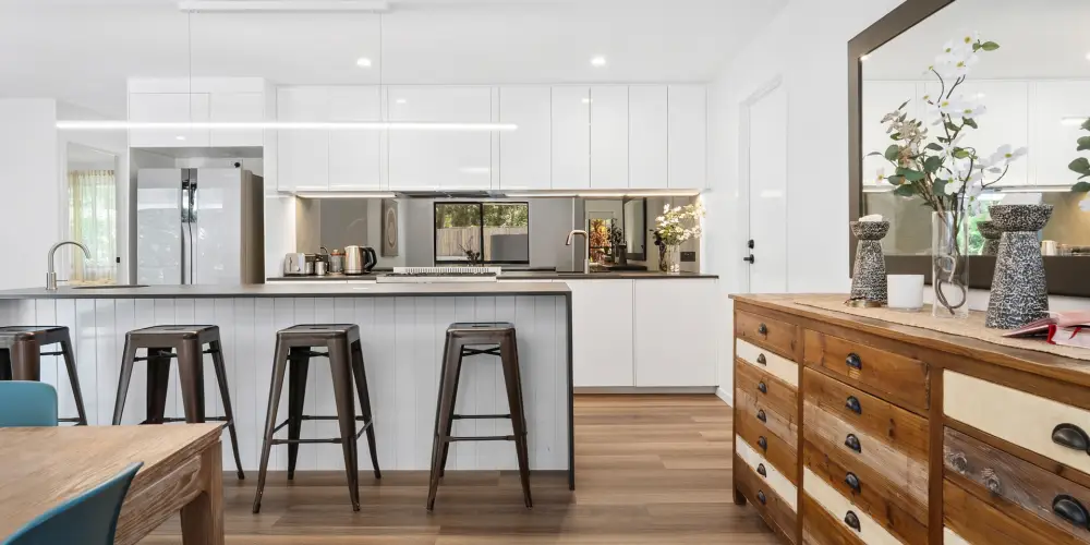 - Kitchen: huge breakfast bar; soft close cabinetry; porcelain benchtops; mirrored splashback; Italian electric oven with gas cooktop; integrated dishwasher; generous storage