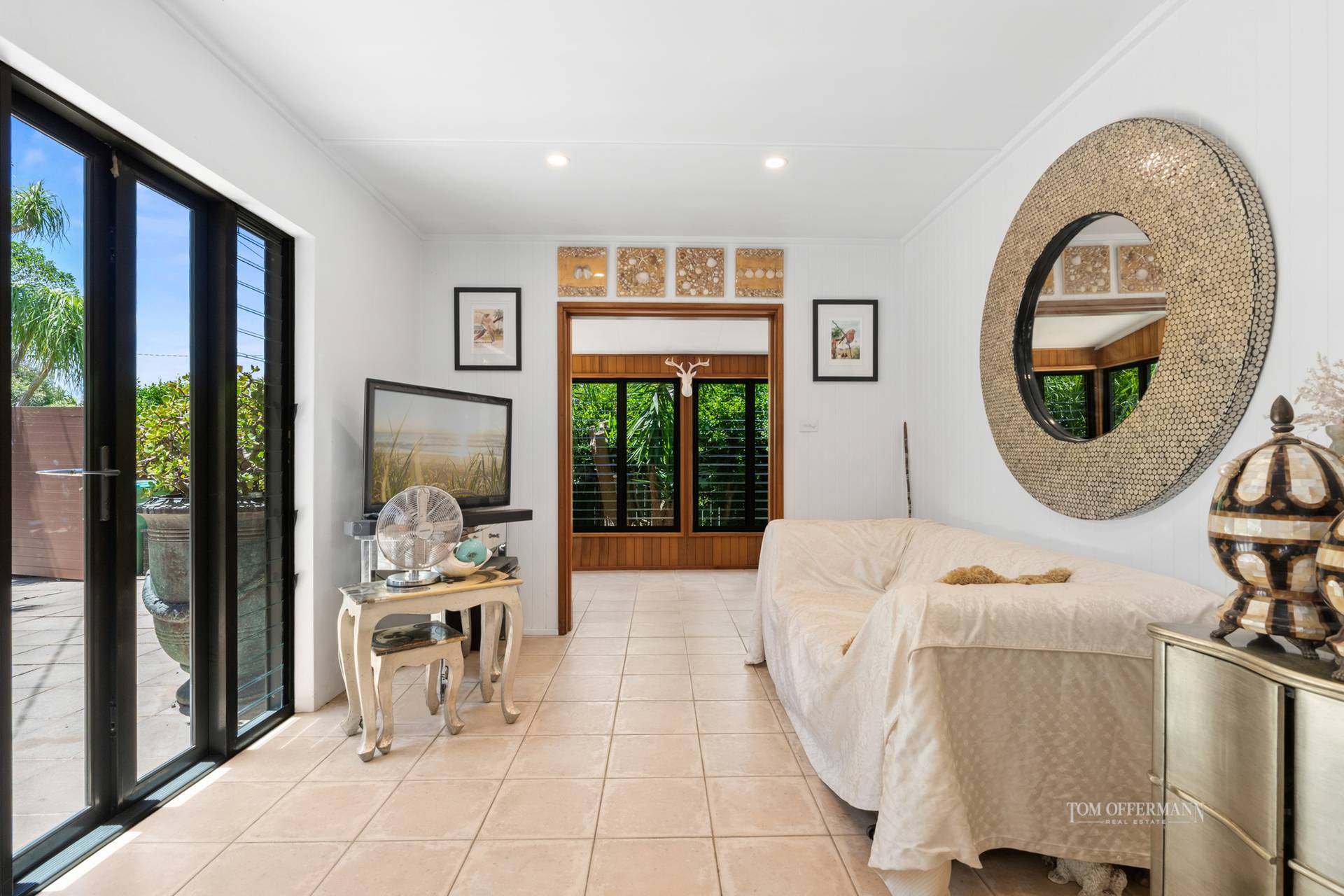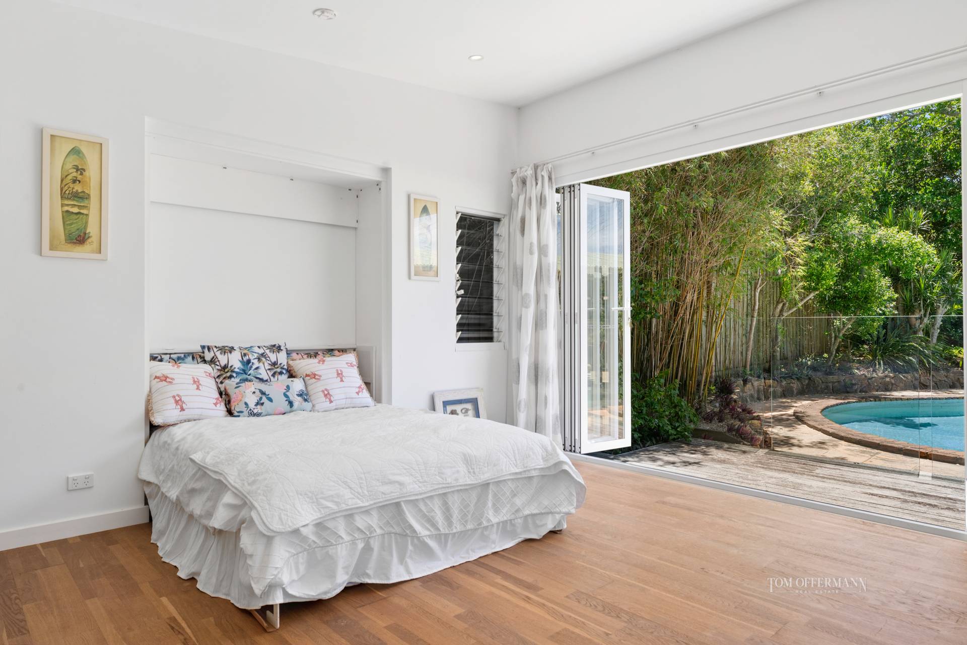 The main residence reflects classic beach-house design, with two well-proportioned bedrooms, a central bathroom and open-plan living spaces that invite relaxed living. Sliding doors open to an expansive patio, creating a seamless indoor-outdoor connection and overlooking the central resort-style pool, the heart of the home and ideal for entertaining, relaxing or soaking up long summer days.