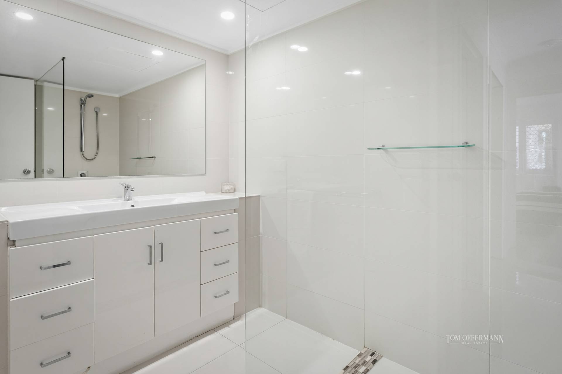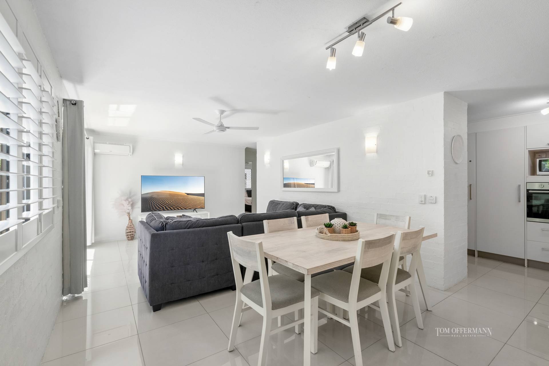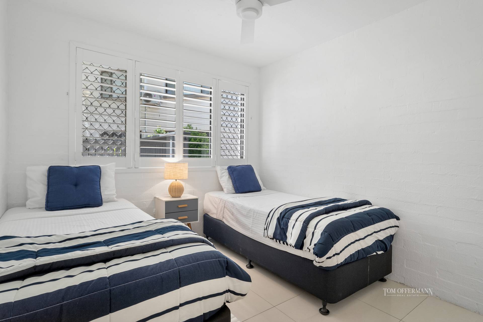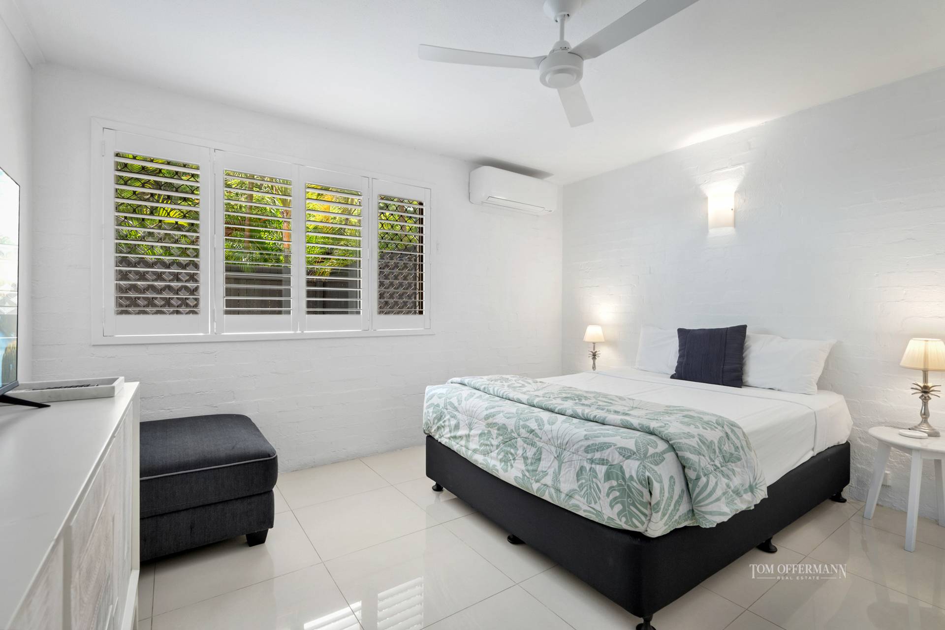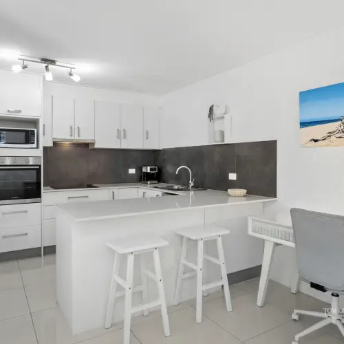 - About: ground floor; first door inside building from external pathway; bright white interior w bagged brick textured walls & creamy white floor tiles; security screens; open plan living/dining w sliders out to alfresco entertaining terrace; 2 large bedrooms w built-in robes & timber shutters; master looks out to terrace; recently renovated all-white bathroom w stone-topped 2-pac vanity; powder room; laundry w washer & dryer; C-shaped kitchen w white stone-topped cabinetry/breakfast bar; dark grey-tiled splashback; Chef oven + cooktop; microwave; fridge; aircon/fans