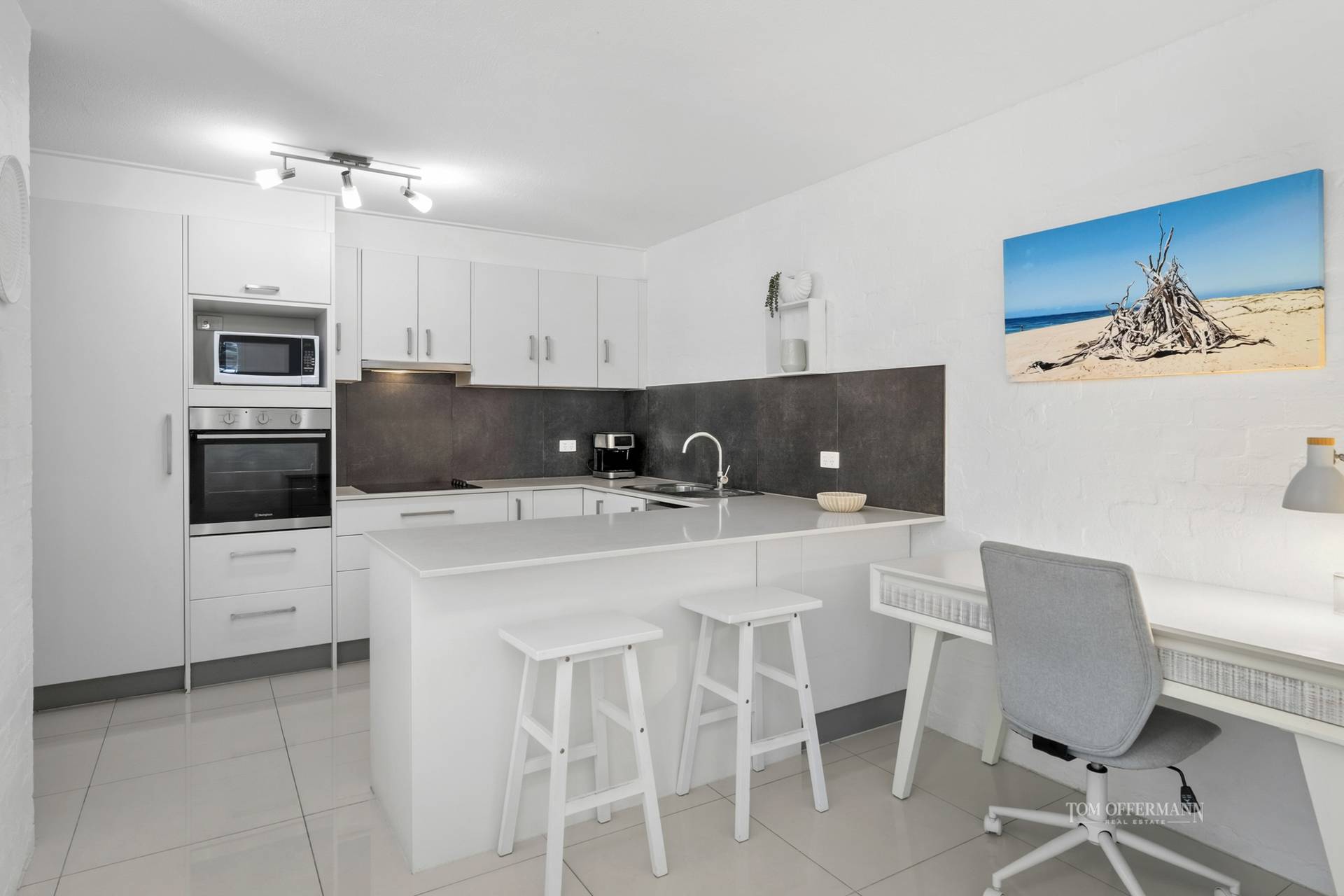 The roomy C-shaped white kitchen with stone-topped cabinetry/breakfast bar, has a grey-tiled splashback plus all the necessary accoutrements and appliances to inspire a creative cook.