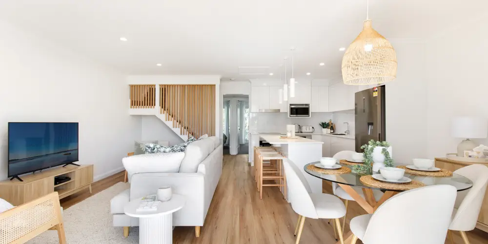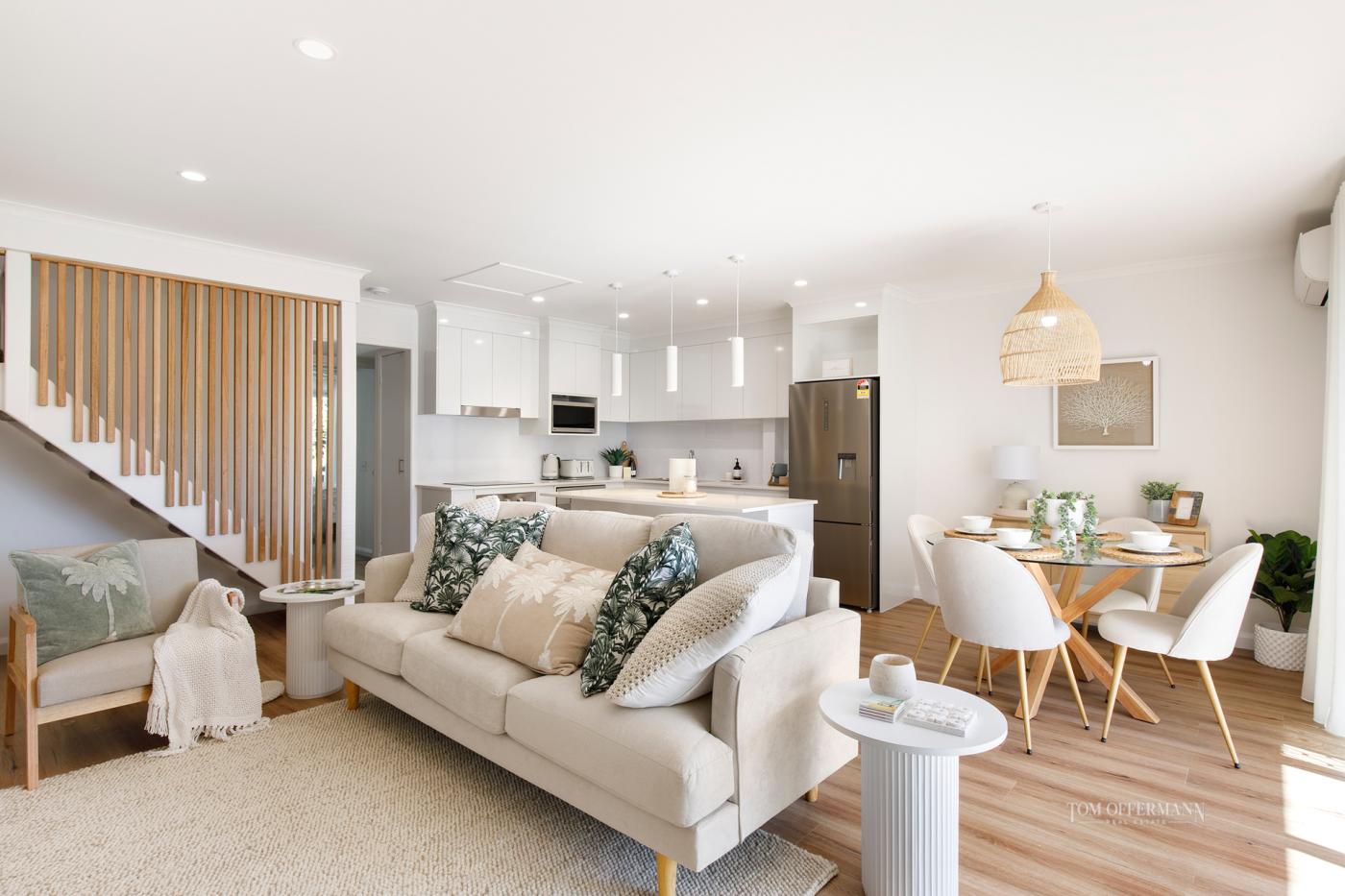 Step inside and discover a serene coastal haven where a sophisticated renovation meets relaxed beachside style. Wispy sheers drift gently in the breeze, a glass-topped dining table is paired with sculptural white bucket chairs, light timber accents add warmth, and sumptuous neutral sofas are layered with palm-inspired textures. The ambience is uplifting and refined, while the clever open-plan design embraces climate and connection to the outdoors - delivering an effortless, year-round holiday lifestyle.