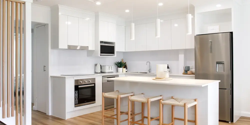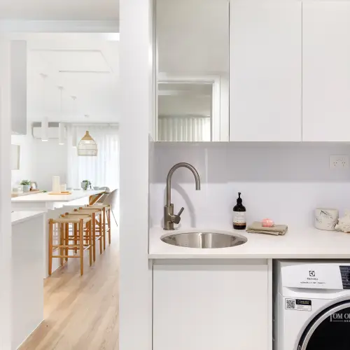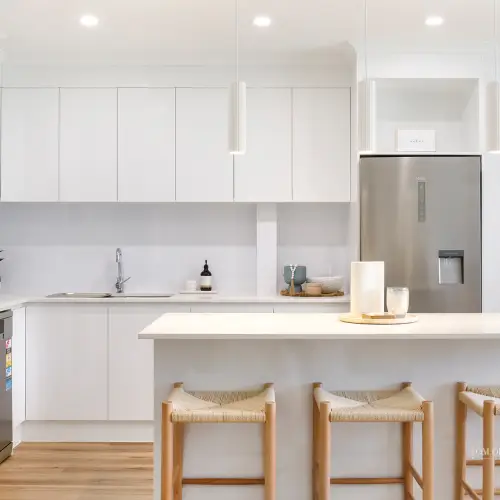The sleeping quarters continue the coastal aesthetic, soft, fresh and inviting. They extend to a private terrace overlooking the tranquil Weyba Creek Conservation Reserve. Above, a versatile loft offers flexibility as a third bedroom, study or children’s retreat. At the heart of the home, the light-filled contemporary kitchen impresses with stone benchtops, a breakfast bar, sleek 2-pac cabinetry and premium appliances - perfectly suited to entertaining or intimate dinners at home.