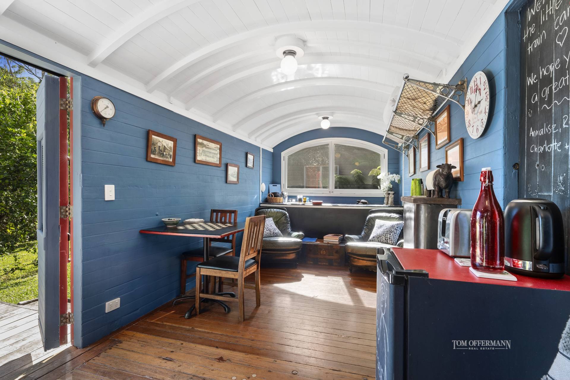 Retro and romance combine on the ground level where a restored vintage sleeper train carriage has a bedroom, cooking facilities and a terrace.