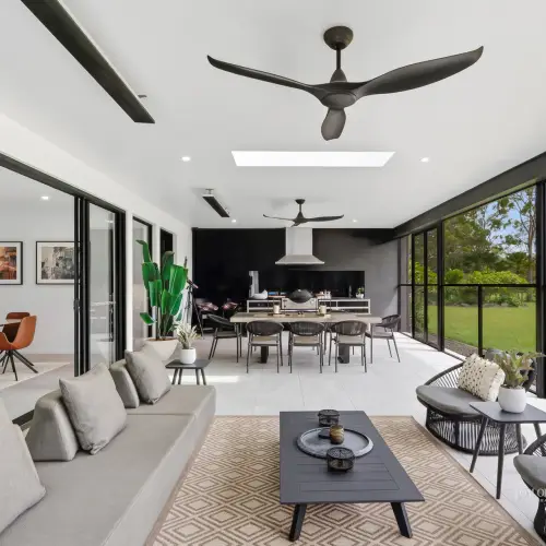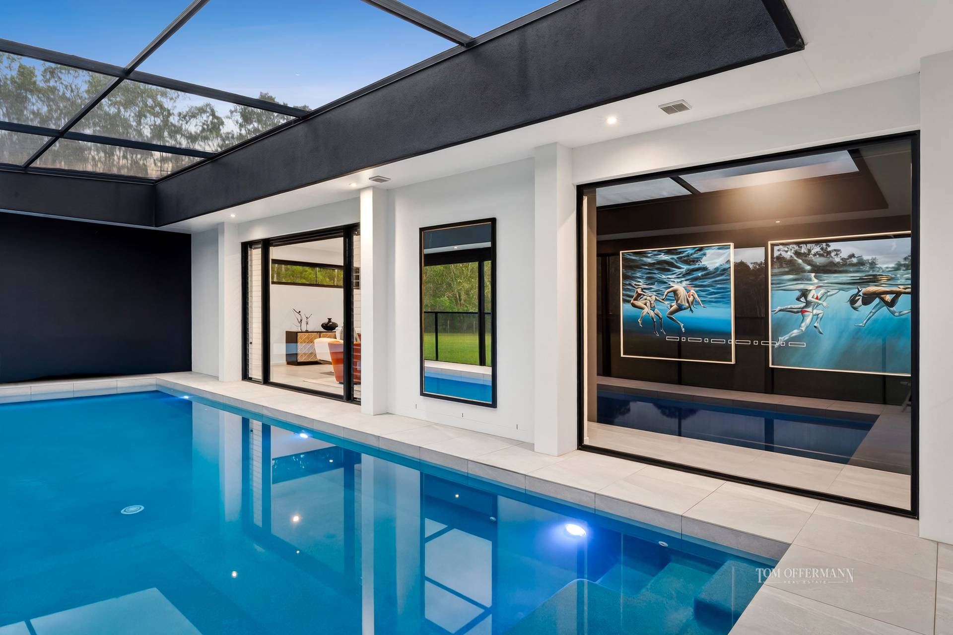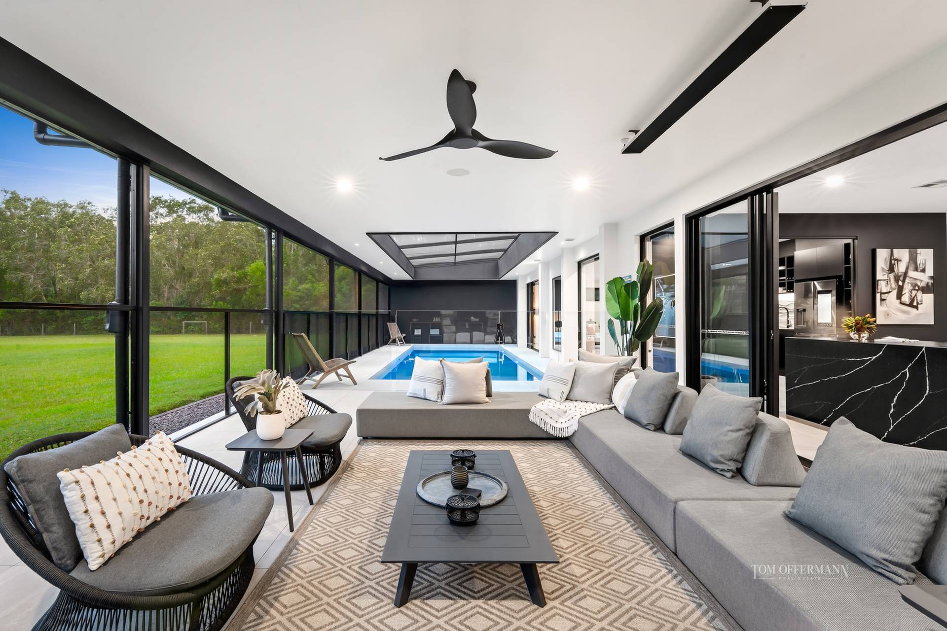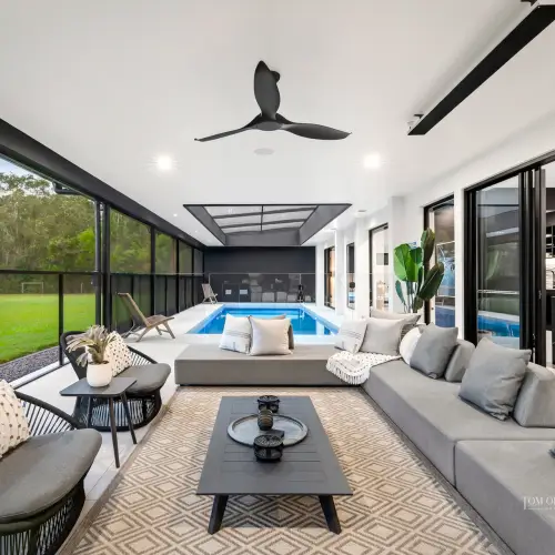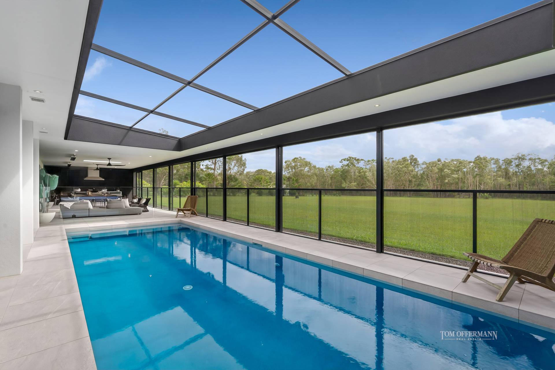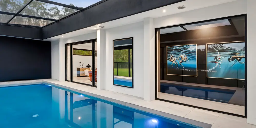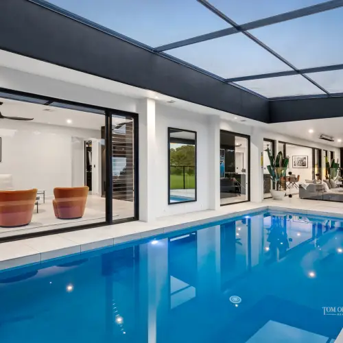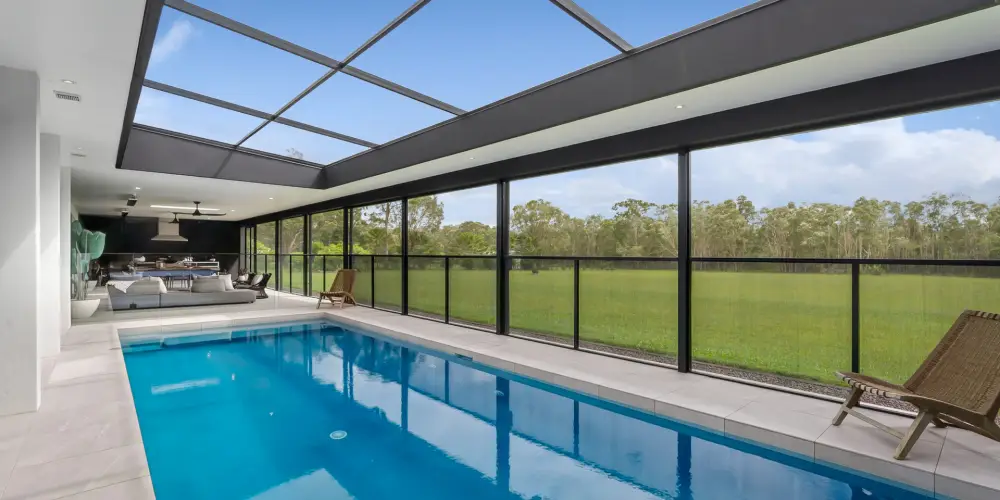 - Pool Pavilion & Outdoor Room: 9.9mx3.5m heated pool; terrace incl pool nth-side (slide away) & ceiling above enclosed w UV cyclone rated insect screening; thermal pool blanket