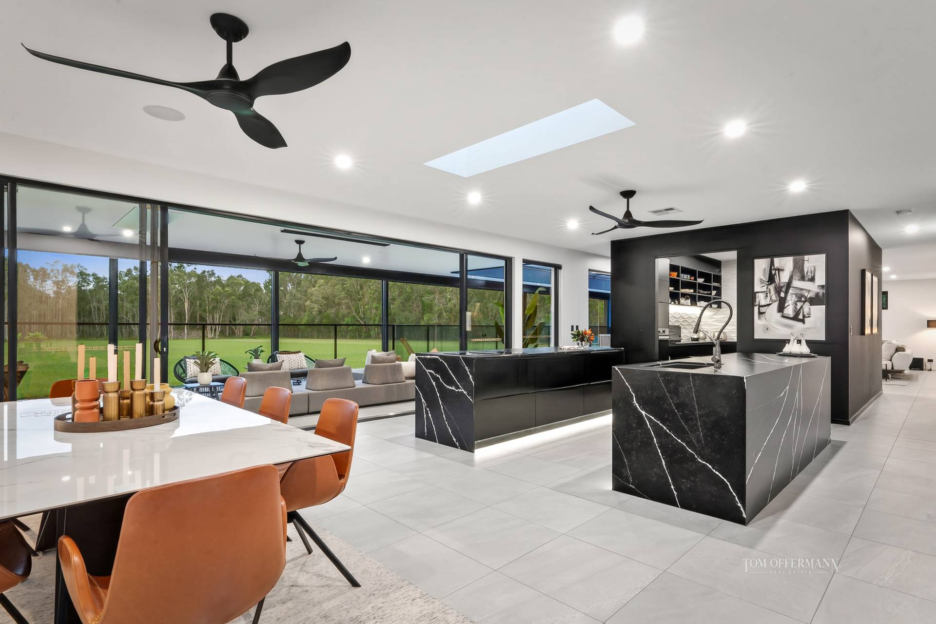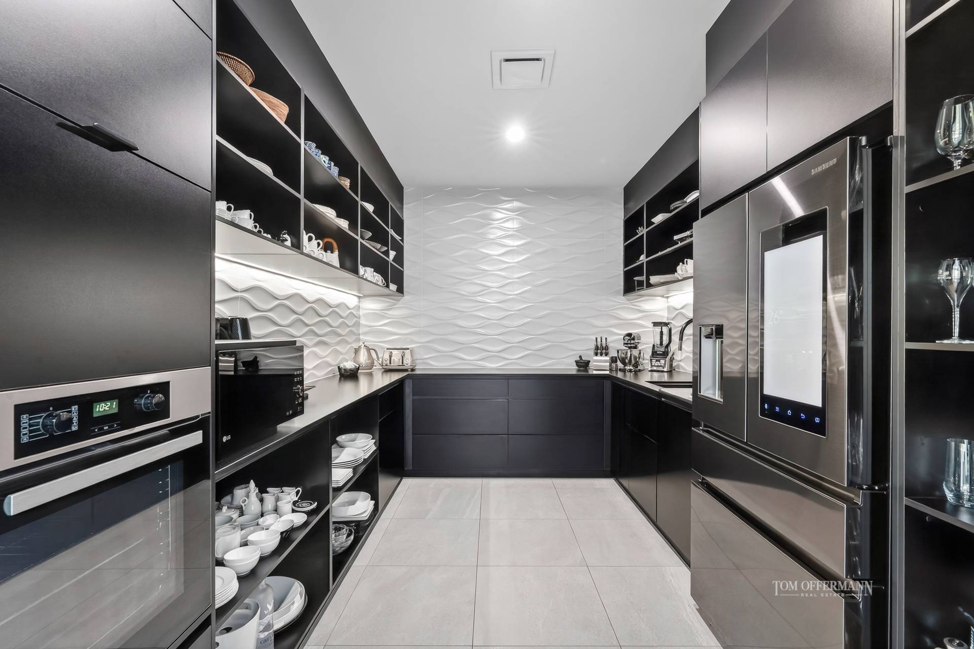Complementing the intelligent design and size of the residence, it features two, yes two parallel island breakfast bars with black and white-streaked stone-topped cabinetry, soft close deep drawers, similarly the sizeable butler's pantry with three-dimensional lustre wave tiles and naturally the latest appliances from induction cooktop and oven, to integrated dishwasher and a four-door fridge with television.