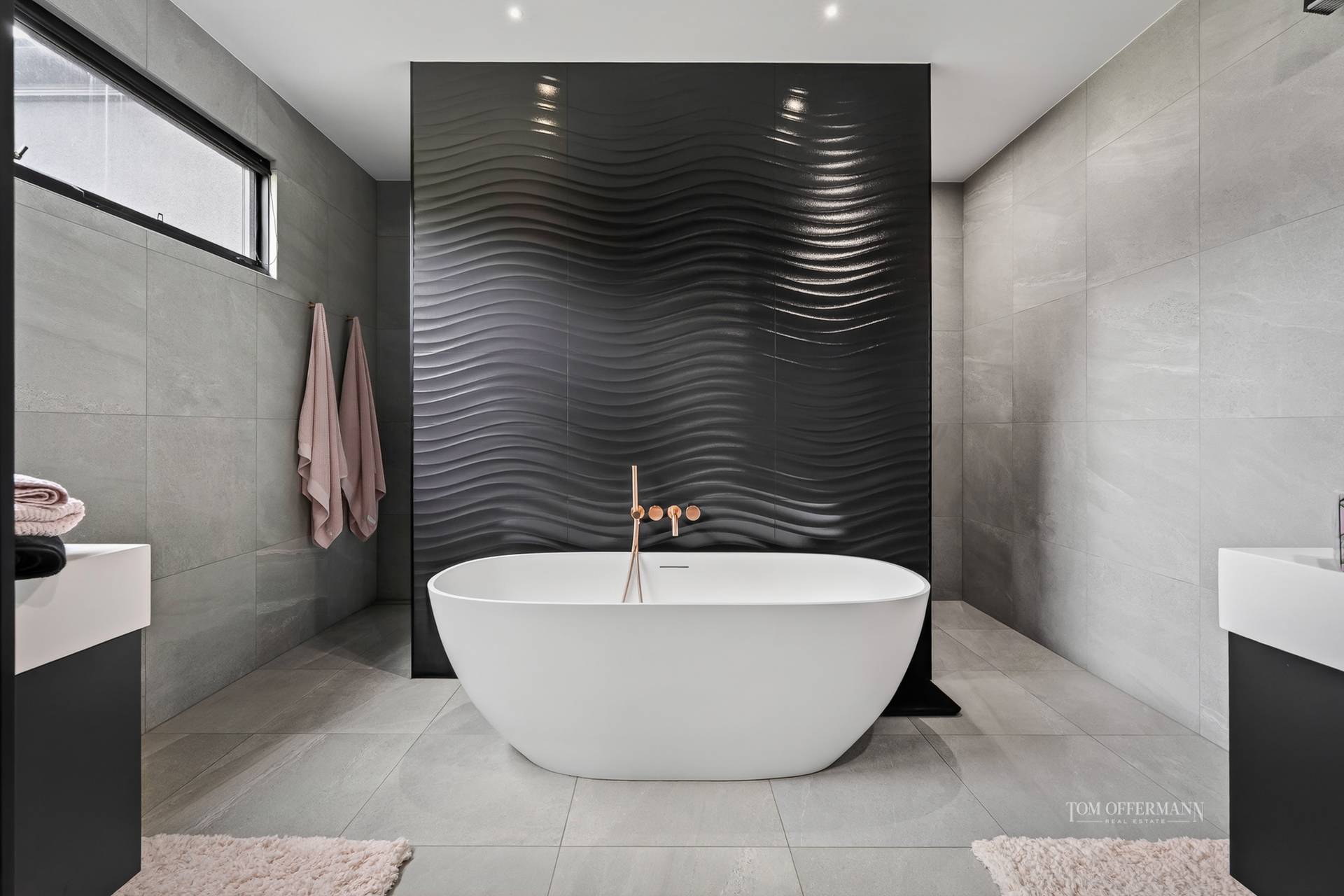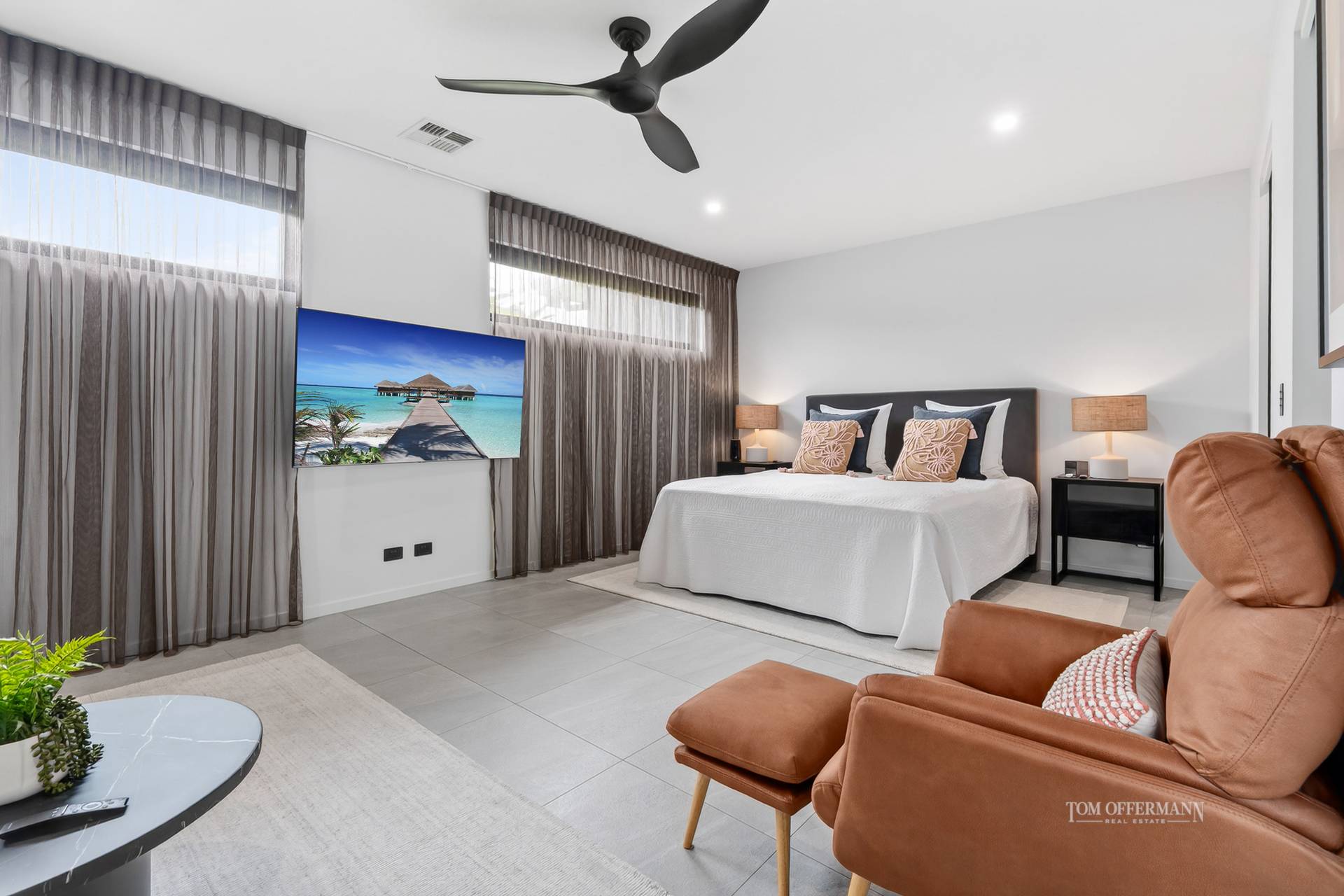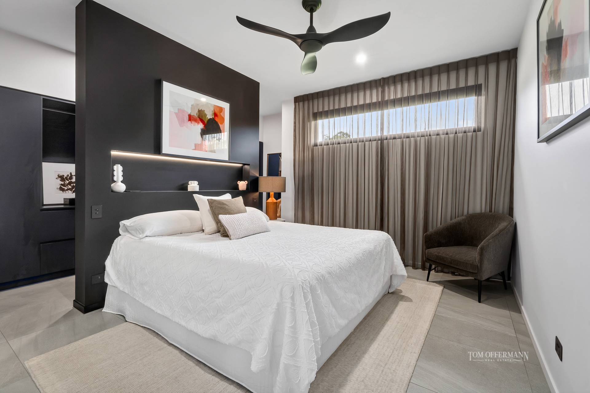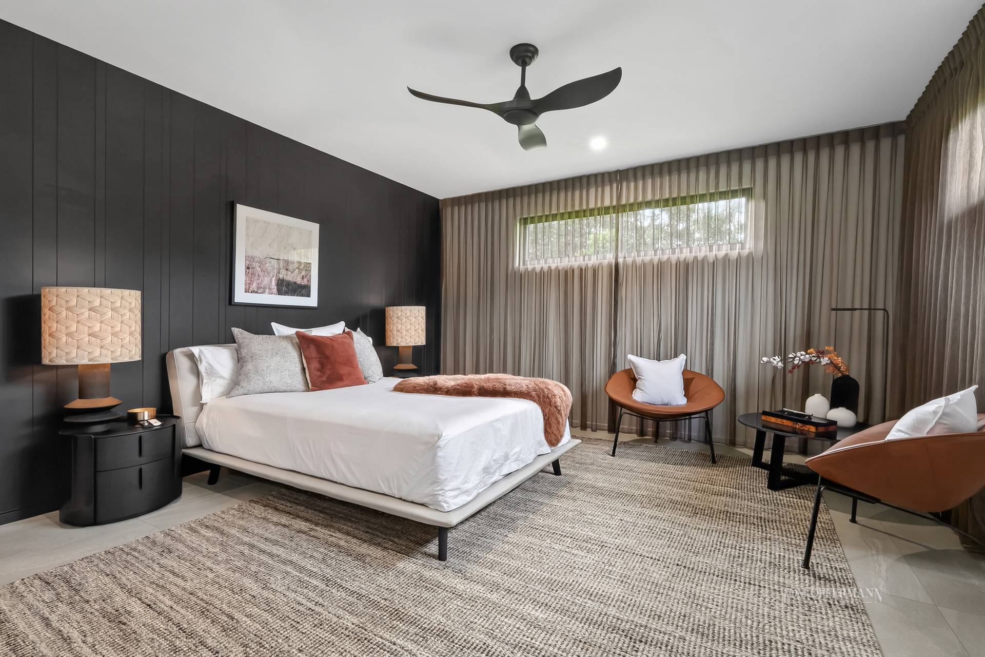 - Bedrooms/Bathrooms: 4 w wispy sheers, WIRs; ensuites w fan heating, European wall & floor tiles, & custom Arkistone topped incl single basin black timber cabinetry w track lighting under; premier suite retreat w TV, custom headboard & reading lights, fashionista-style WIR & ensuite