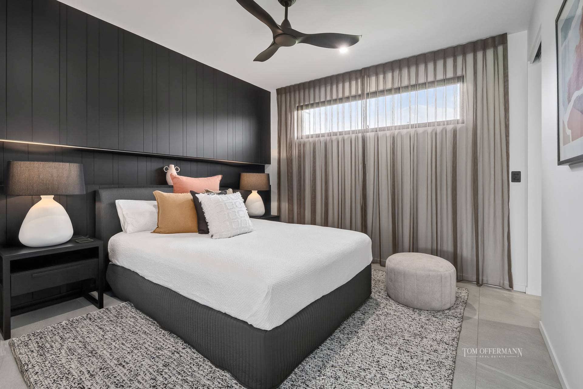 When it comes to dreamtime there are four equally stunning bedrooms with wispy sheers, walk-in robes and ensuites with Italian wall and floor tiles, custom stone topped including the basin on black timber cabinetry.