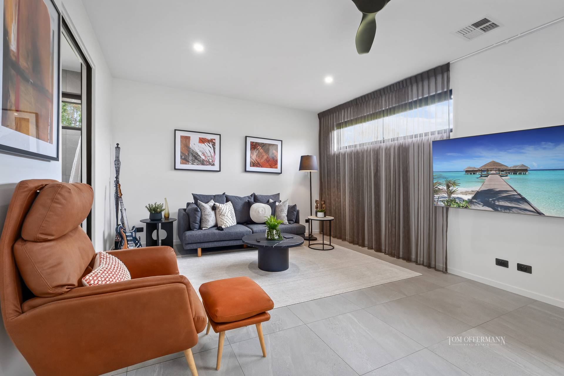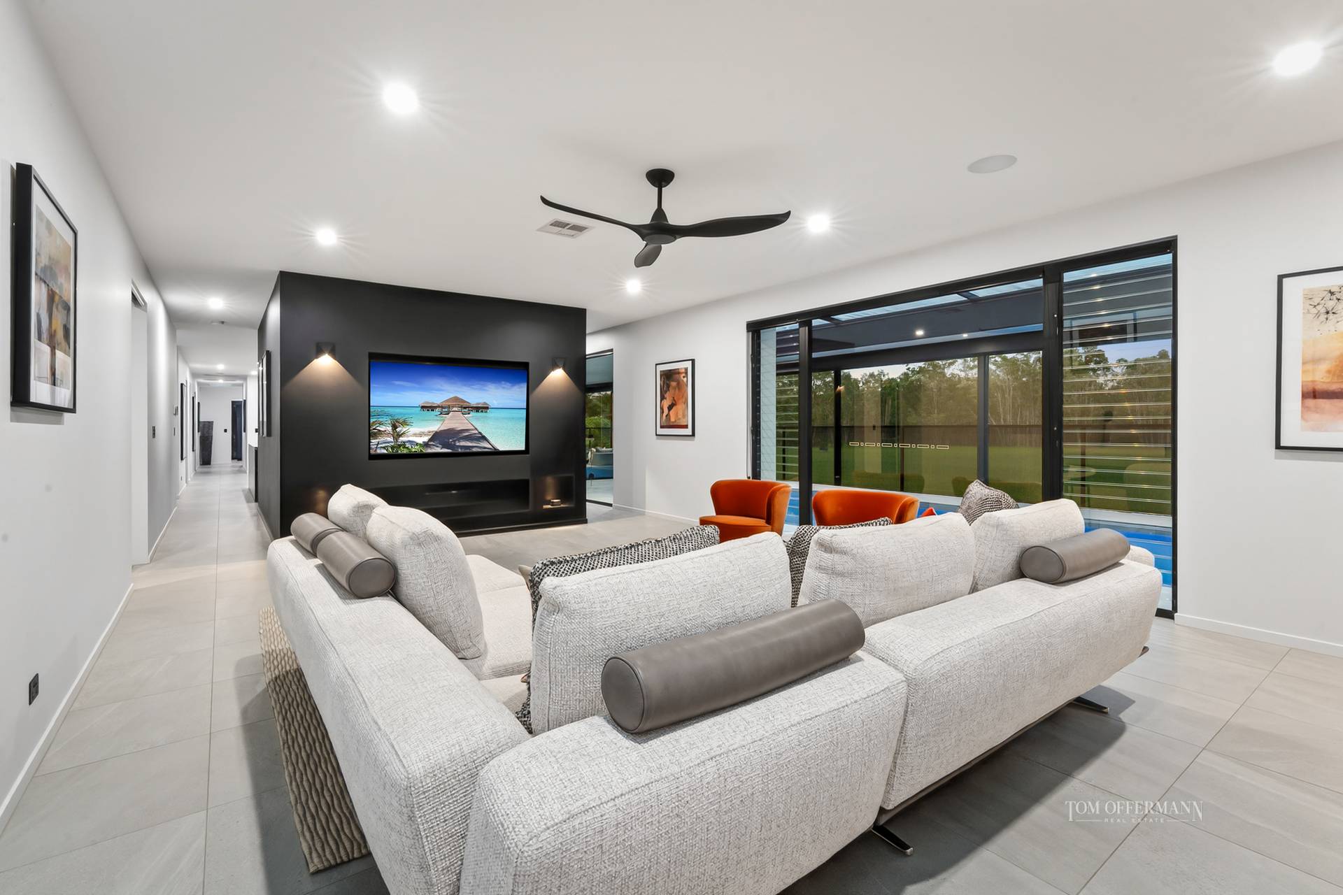 - Living/Dining: lounge with lit niches, 2 feature led wall lights, sound bar, surround sound, linen sheers