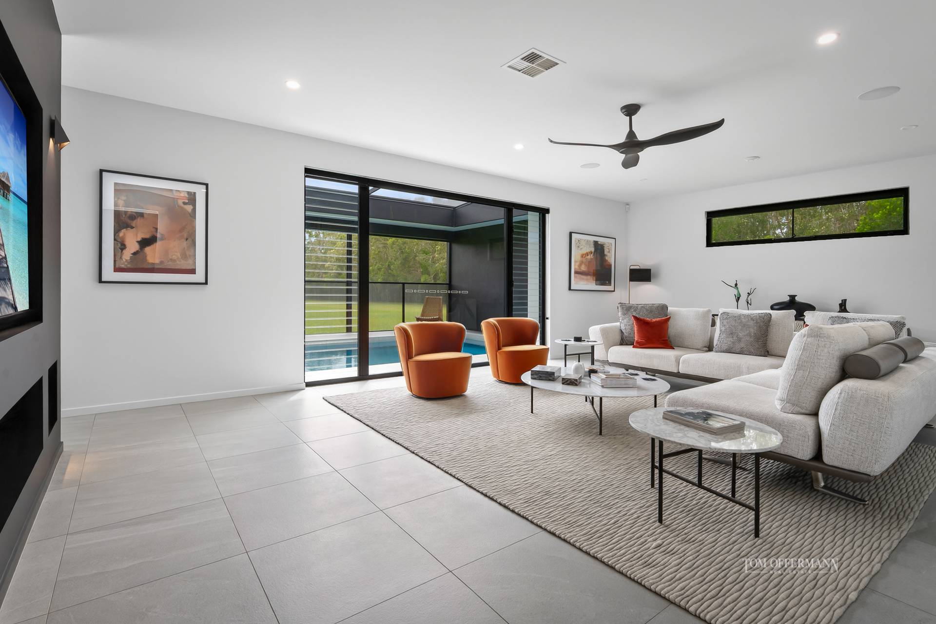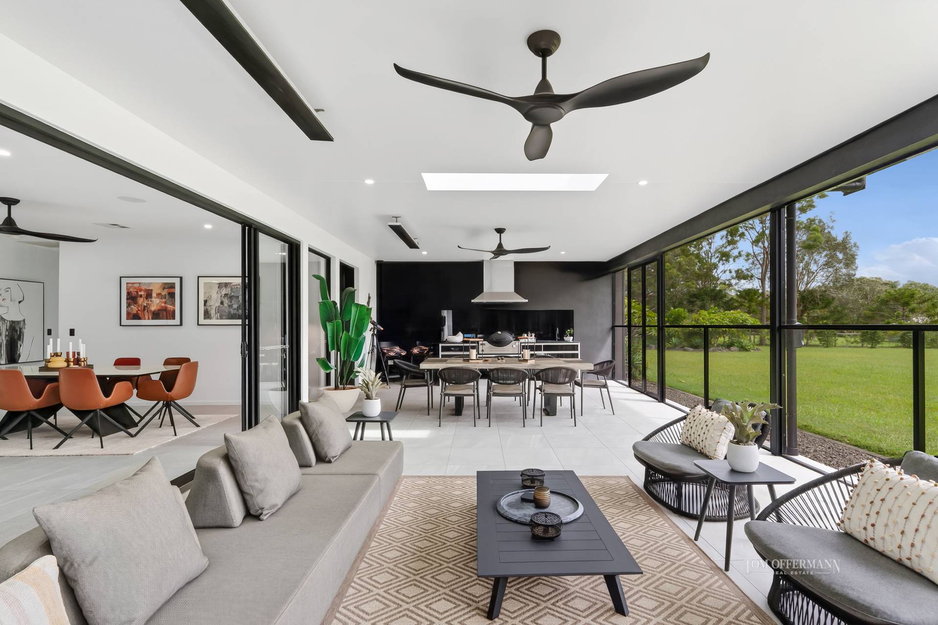 Open the statement double timber-framed lami-glass doors to the foyer. Look beyond. There's an obvious sense of indisputable splendour, fashioned with timeless design provenance including a distinctive and considered monochromatic aesthetic. Disappearing tall doors and walls of glass, high ceilings and skylights invite the northerly light indoors to shadow dance over the Italian pastel grey stone flooring. It coalesces perfectly with the wondrous outdoors which is certainly incomparable.
