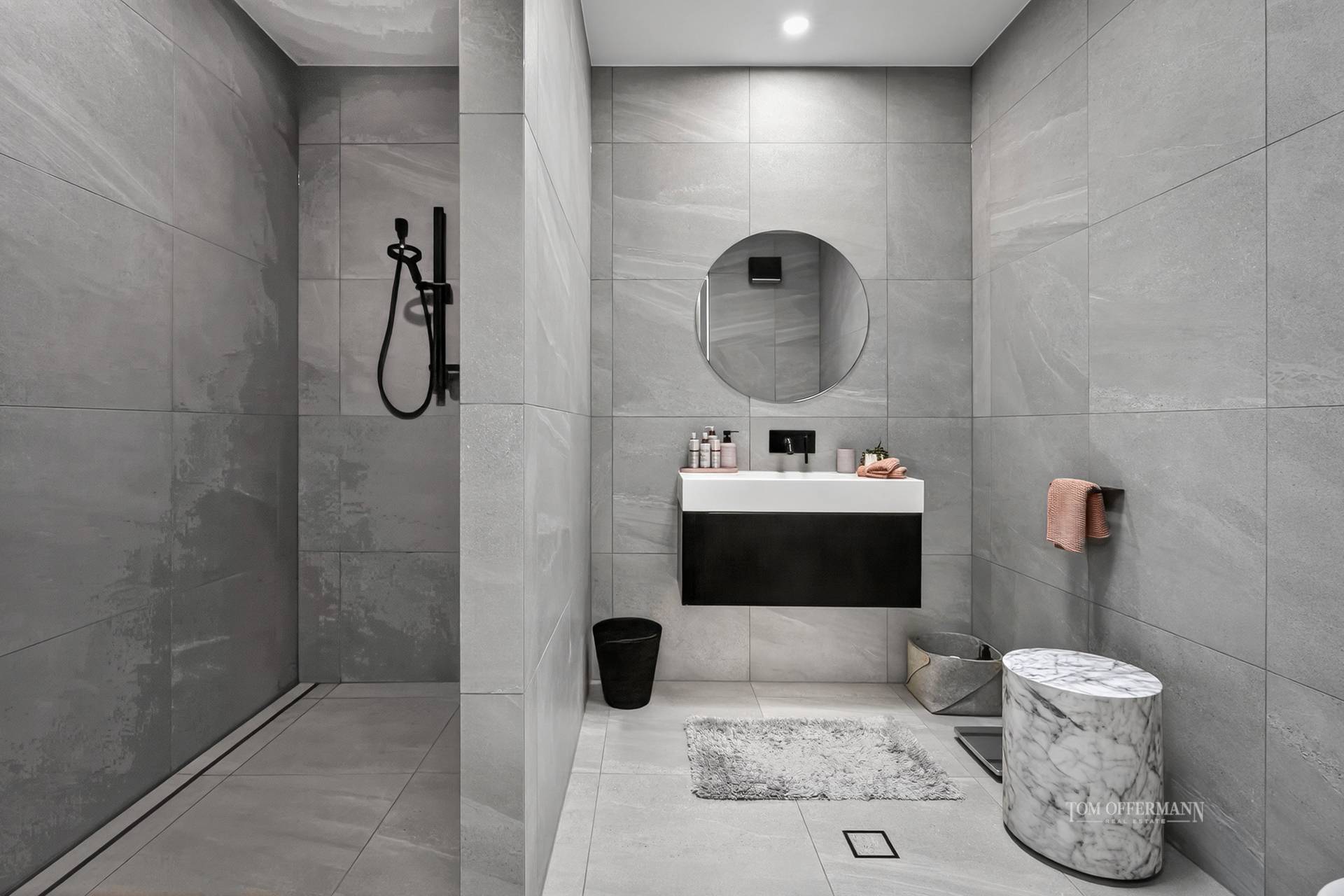 - Features: custom design & build; statement custom laser-cut entry gate; monochromatic aesthetic; timber framed dble entry door w feature lami-glass; Italian pastel grey stone flooring throughout incl pool & terrace; high ceilings; 4 x dble glazed sky lights; ducted 6kW aircon; fans all spaces; window blinds, wispy sheers & insect screens