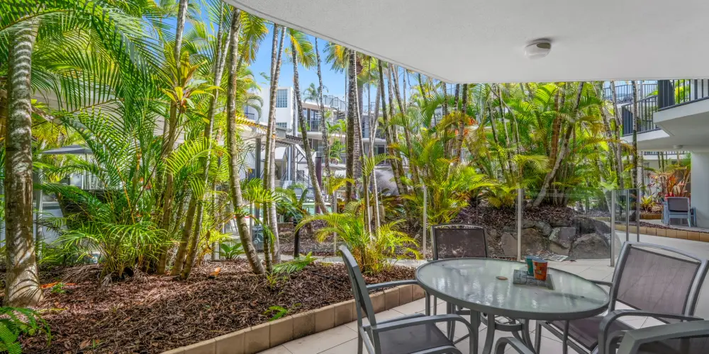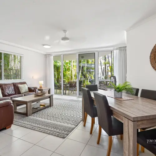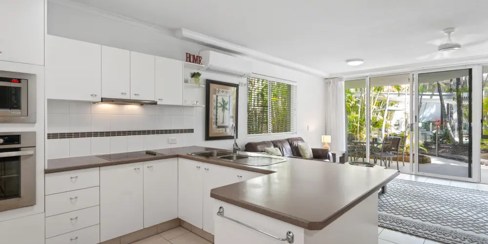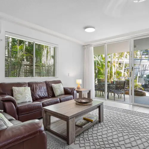 The open-plan living, dining and kitchen zone is light-filled and easy, with ceiling fan and air-conditioning ensuring blissful comfort year-round. Sliding doors connect almost seamlessly to the courtyard patio, where the resort pool shimmers just beyond - indoor and outdoor living coalescing in that effortless way Noosa does so well.