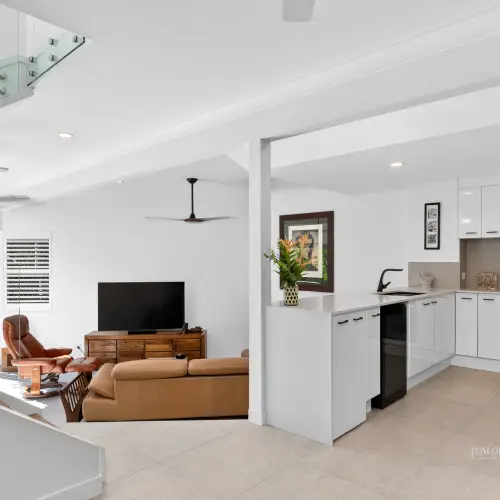Inside is designed for the good life plus it mimics outdoors with complementary furniture, Lucci Abyss timber fans and curated artifacts. Banks of disappearing doors and louvres across the designated high-ceilinged living and dining levels, invite streams of natural light to shadow dance across the lime washed-effect stone floors from both undercover terraces with distinctive merbau decking.