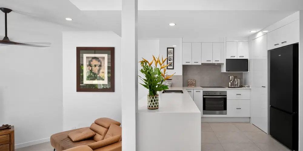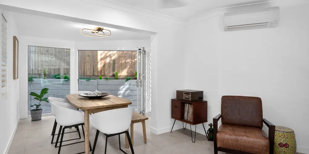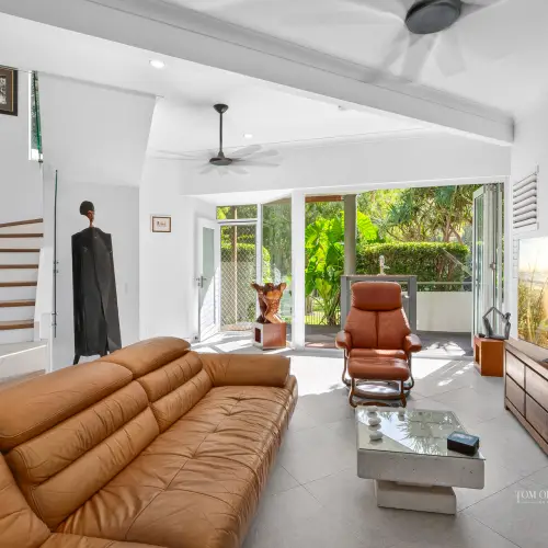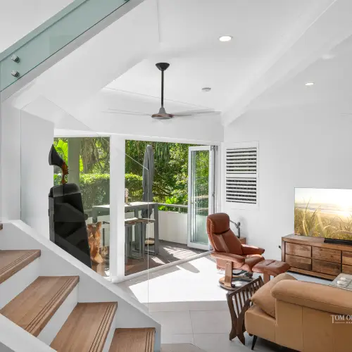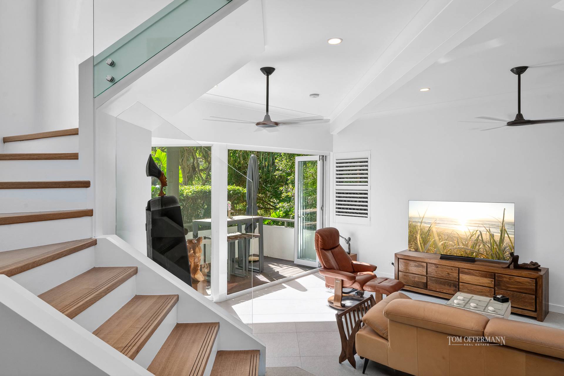 • Features: secluded private boutique triplex w 1 neighbour; side hedged pathway to entry; ceiling heights 2.5m upstairs & 3.1m downstairs; lime washed-effect stone flooring; plantation shutters/louvres/slide away glass doors; aircon/Lucci Abyss timber fans; Orbit pendant lights; easy timber tread stairs w glass balustrading